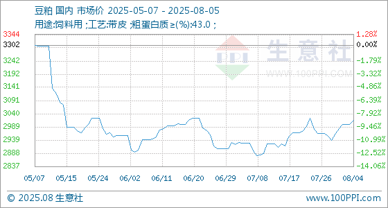 8月5日,生意社豆粕基准价为3016.00元/吨,与本月初(2984.00元/吨)相比,上涨了1.07%。
