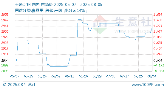 8月5日,生意社玉米淀粉基准价为2940.00元/吨,与本月初(2934.00元/吨)相比,上涨了0.20%。
