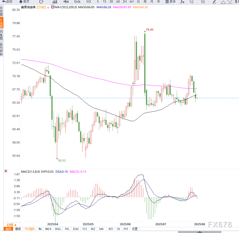 若后市跌破65.50美元的前期支撑位,恐将测试64.00美元附近的关键防守位;反之,若重返68.50美元上方,则可能重启反弹走势。整体来看,空头占优,短期走势偏空,但需警惕政策或地缘事件触发的技术性反弹。