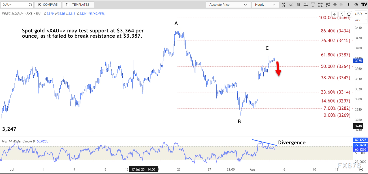 路透技术分析师指出,现货黄金可能测试每盎司 3364 美元的支撑位,因为未能突破 3387 美元的阻力位。