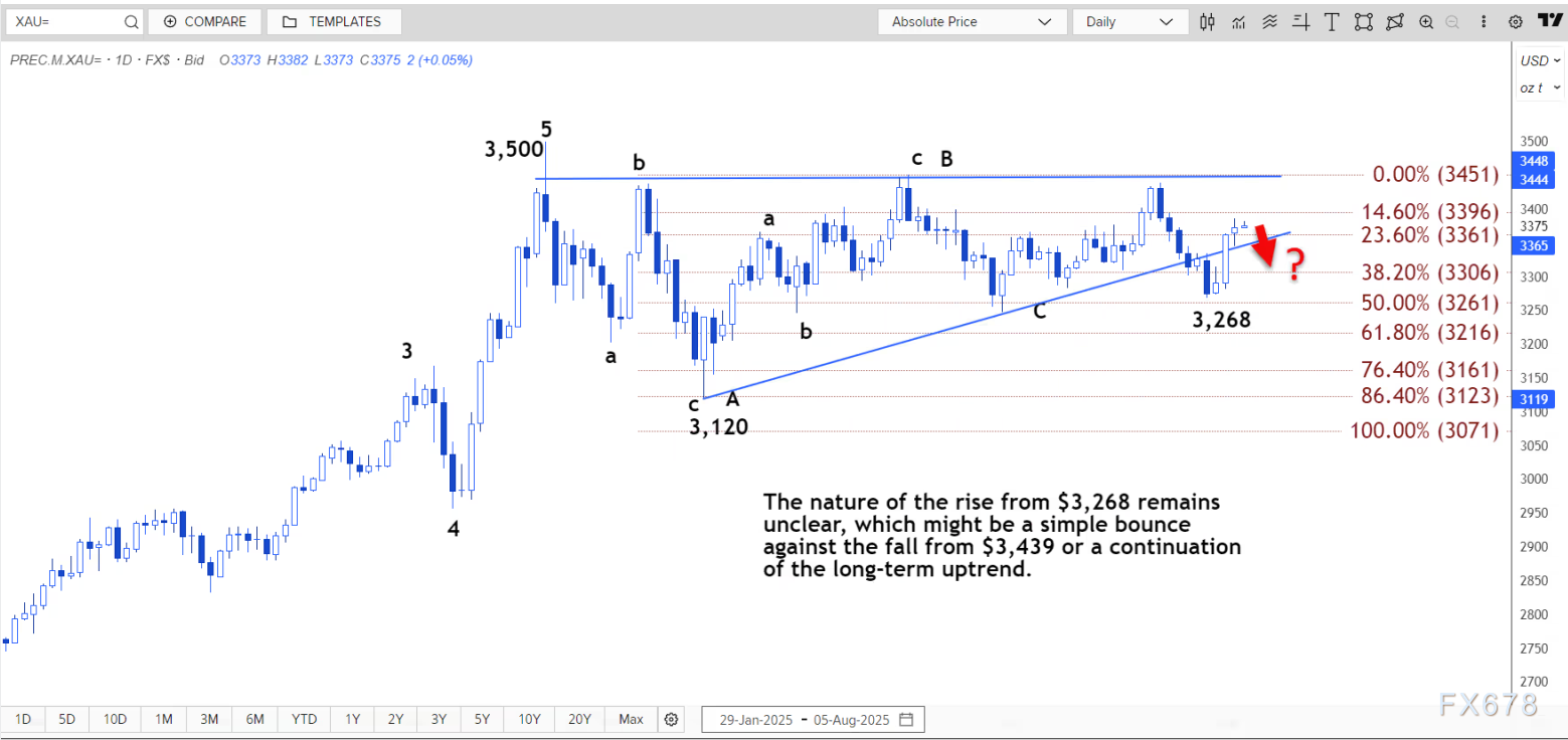 如果向上突破 3387 美元,可能进一步上涨至 3415 至 3434 美元区间。日线图显示,自 3268 美元以来的上涨走势尚不明朗,可能是对自 3439 美元下跌后的简单反弹,也可能是长期上涨趋势的延续。