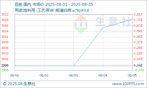 据生意社商品行情分析系统显示:8月初,利多支撑,豆粕行情迎来上扬。8月1日,豆粕市场均价2998元/吨,8月5日,豆粕市场均价3020元/吨,价格上涨0.73%。