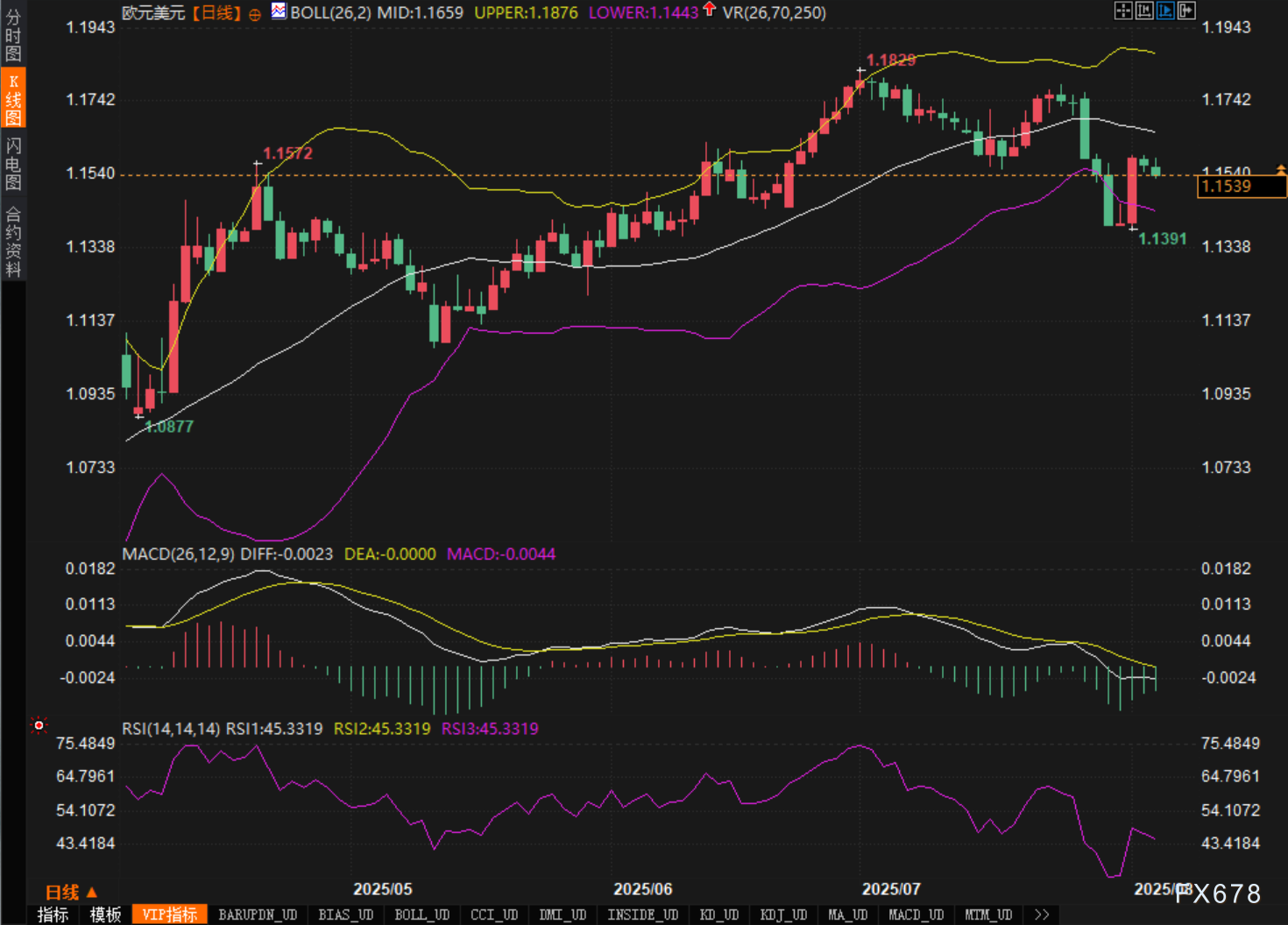 RSI(14)维持在45附近,显示汇价未进入超买或超卖区间,处于中性偏弱的技术状态。分析认为若价格继续站稳1.1500上方,短期有望再度测试1.1600-1.1650阻力区域;反之若跌破1.1440,则需警惕回落测试前低1.1391及1.1300支撑带。