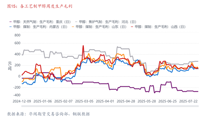 7月,各工艺路线制甲醇利润变化略显差异,其中煤制、焦炉气制利润空间均有扩大,而天然气制甲醇则维持亏损,且周期内亏损幅度走扩。煤制、焦炉气制甲醇价格均不同程度低位抬升;虽煤炭因迎峰度夏季节性需求旺季价格低位稳健上涨,不过整体成本上涨力度仍弱于甲醇价格涨幅,故以上两工艺制甲醇利润均有提升。然天然气制甲醇虽7月气价整体波动不大,成本端相对稳定,然川渝甲醇弱供需对区内价格形成压制,故该工艺制甲醇利润亏损有所放大。(图15)。
