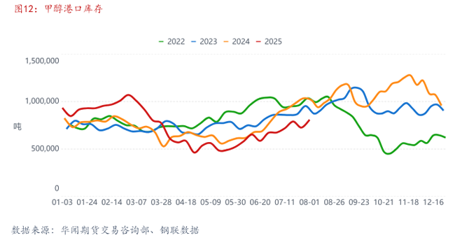 2025年7月底,甲醇港口库存量80.84万吨,平均库存74.34万吨,较上月增加19.41%(图12)。