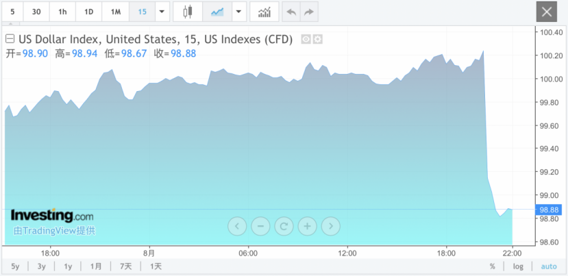 受此影响,美元指数直线跳水,大跌超1%,创6月12日以来最大单日跌幅。非美货币全线拉升,截至北京时间22:15,美元兑日元大跌1.8%,欧元兑美元大涨1.27%,澳元兑美元涨0.6%,英镑兑美元涨0.43%。