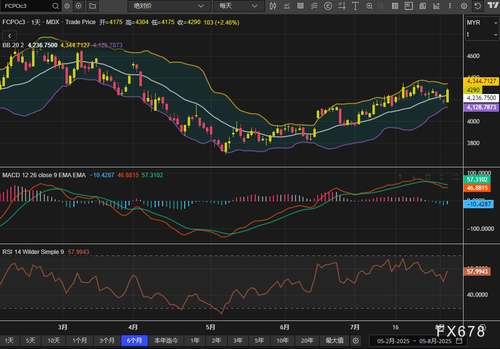 汇通财经APP讯——周二(8月5日)马来西亚棕榈油期货今日结束两日连跌,主力FCPOc3合约收报4290林吉特/吨,单日涨幅2.46%,盘中一度触及4345林吉特的布林带上轨压力位。技术指标显示短期动能转强:MACD柱状图收窄至-10.4,RSI(14)回升至68附近,逼近超买区间。这一反弹行情主要受到空头回补、大连棕榈油期货企稳,以及市场对8月上旬出口数据改善预期的共同推动。