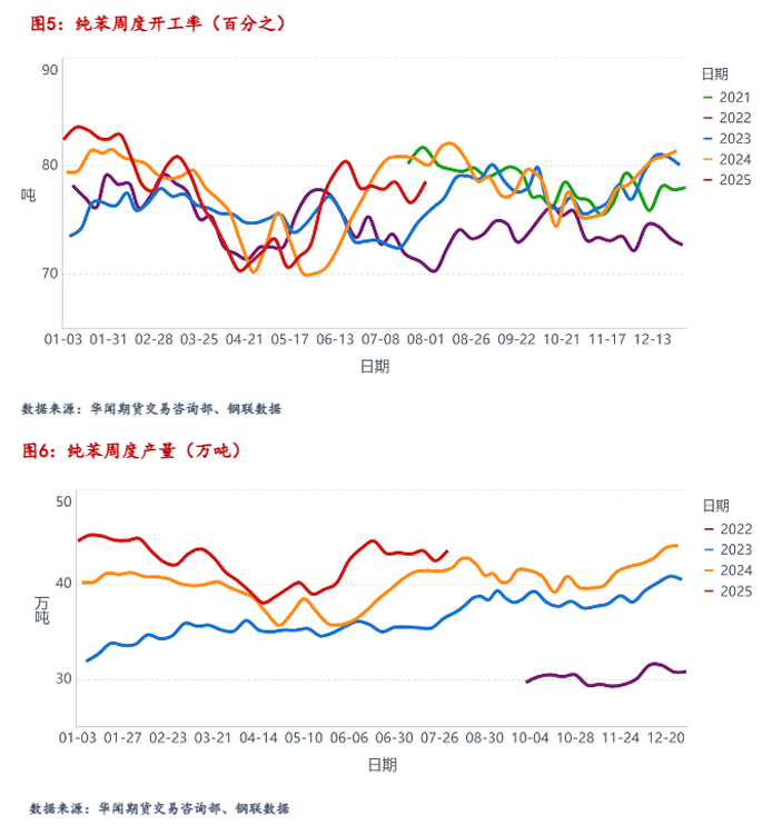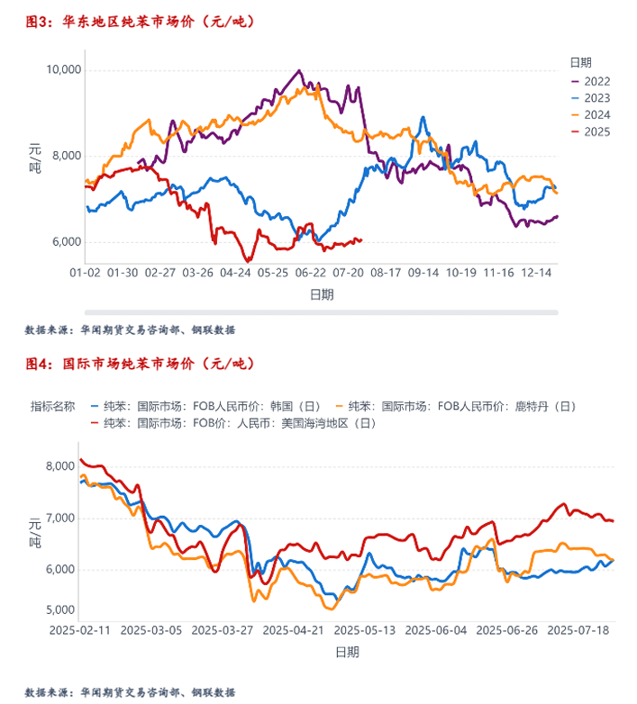 7月份华东地区纯苯市场价格整体呈现震荡上行走势,月初价格为5905元/吨,月末最高涨至6095元/吨,纯苯市场价格为近四年历史同期最低位。国际市场价格方面,韩国纯苯FOB价格上涨走势稳健,月初韩国纯苯FOB价格为5870元/吨,价格持续上涨,最高涨至月末6209元/吨。欧美地区价格冲高回落,美国纯苯FOB价格波动幅度较大,整体价格较高,上半月价格走强,下半月价格回落。从美韩价差来看,韩国纯苯出口至美的套利窗口仍处于关闭状态,7月份美国对韩关税在24%,美韩纯苯套利门槛较高,进入八月份后,美国对韩国关税调整为15%,套利门槛仍较高,美韩纯苯价差难以弥补关税以获取利润。
