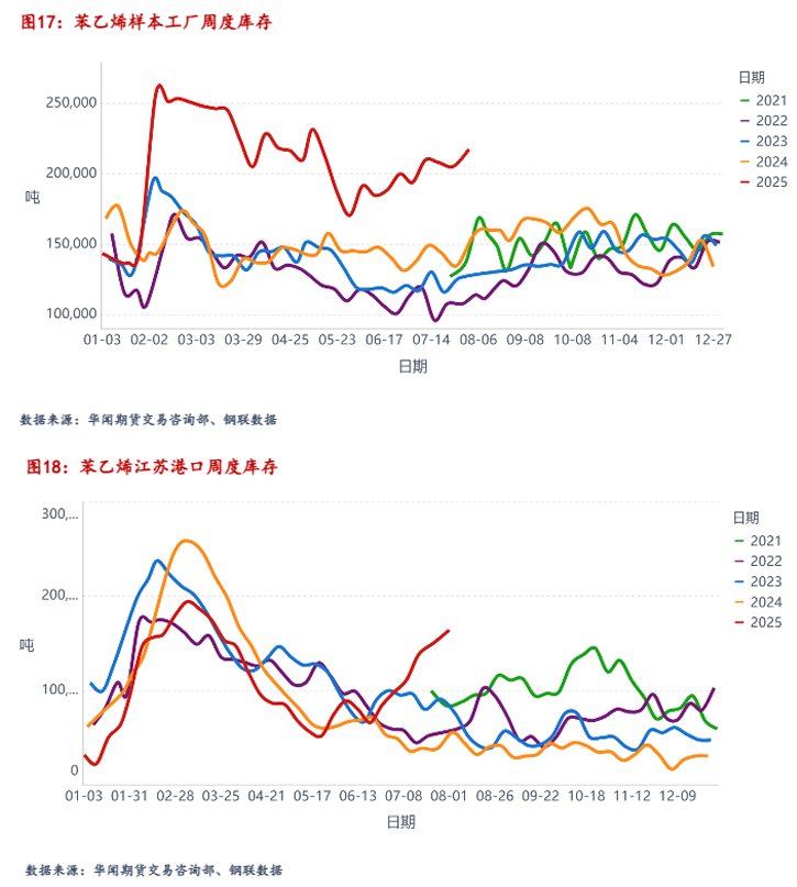 从库存水平来看,厂内库存与港口库存水平均呈现出累积趋势。将厂内库存按比例转换为往年同等样本量,库存仍处于同期偏高水平,厂内库存月初为19.39万吨,月末大幅累积至21.73万吨。从江苏港口库存来看,库存呈现出快速上行趋势,库存水平由9.88万吨增加至月末的16.4万吨,增长12%。当前苯乙烯开工水平维持高位,下游刚需仍在,库存去化有限,8月份港口库存或维持高位震荡变化,随着非一体化苯乙烯装置的生产亏损,降低负荷,库存累积则会放缓,高库存的现实将压制苯乙烯价格的上涨,但远期苯乙烯仍需求前景则会有所改善,关注四季度的库存去化。