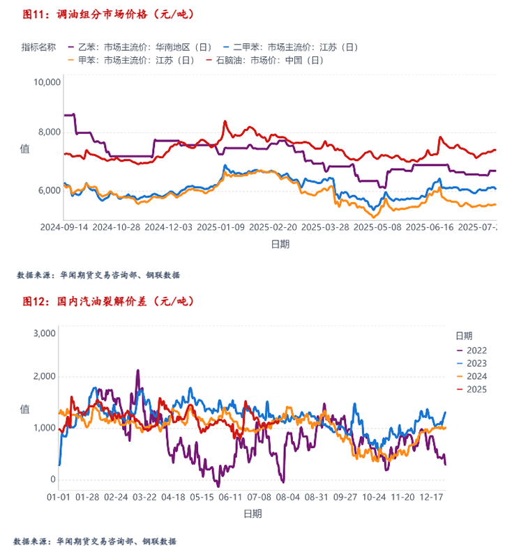 7月份,芳烃调油组分整体下跌,石脑油走势先弱后强,但仍未回到月初水平。调油组分价格,甲苯由5645元/吨跌至5545元/吨。汽油裂解价差方面,七月份从高位下跌,从高位的1289元/吨跌至月末的1141元/吨,裂解价差处于同期中等偏高水平。芳烃调油市场热度整体一般,随着调油季节的结束,纯苯整体偏向于弱势。