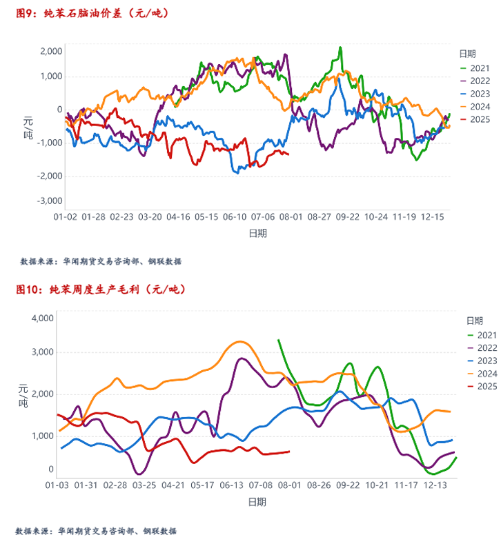从纯苯及石脑油的价差来看,两者价差明显回升,7月4日最低跌至-1685元/吨,月中快速反弹后,月底价差为-1333元/吨。两者价差已经来到近几年同期最低水平,由于纯苯进口较多,中短期内纯苯仍处于相对弱势低位,两者价差仍会在较低水平进行震荡。