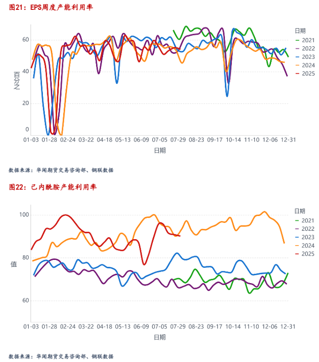 EPS与己内酰胺方面,EPS开工率下滑后再度上涨,近几年产能扩张明显,月初EPS开工率为55.88%,月底EPS开工率为54.25%,处于历史同期偏低位置,因此对苯乙烯消耗量较上月明显降低。纯苯下游的己内酰胺方面开工率处于高位,整月来看开工率小幅下滑,己内酰胺产量较上月增多明显,下游对纯苯刚需较强。