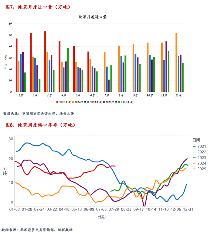 2.纯苯进口同比增多,环比降低,整体仍供应过剩难以企稳;