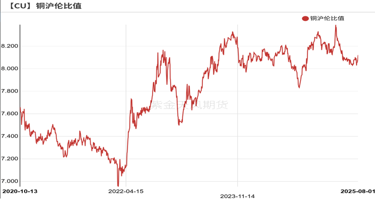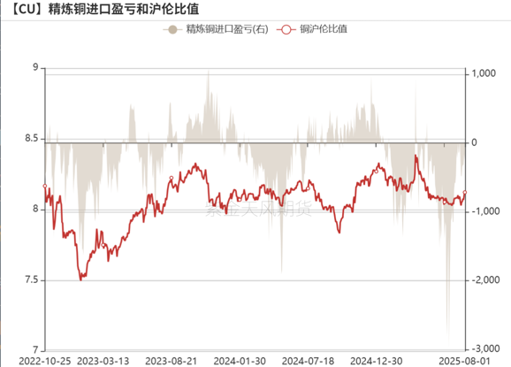 本周,铜价持续回落,国内相对抗跌,沪伦比价小幅修复,维持在8.1附近,进口窗口亏损空间略收窄至300-400元/吨,短期比价波动预计趋于稳定,投机性价比下降。