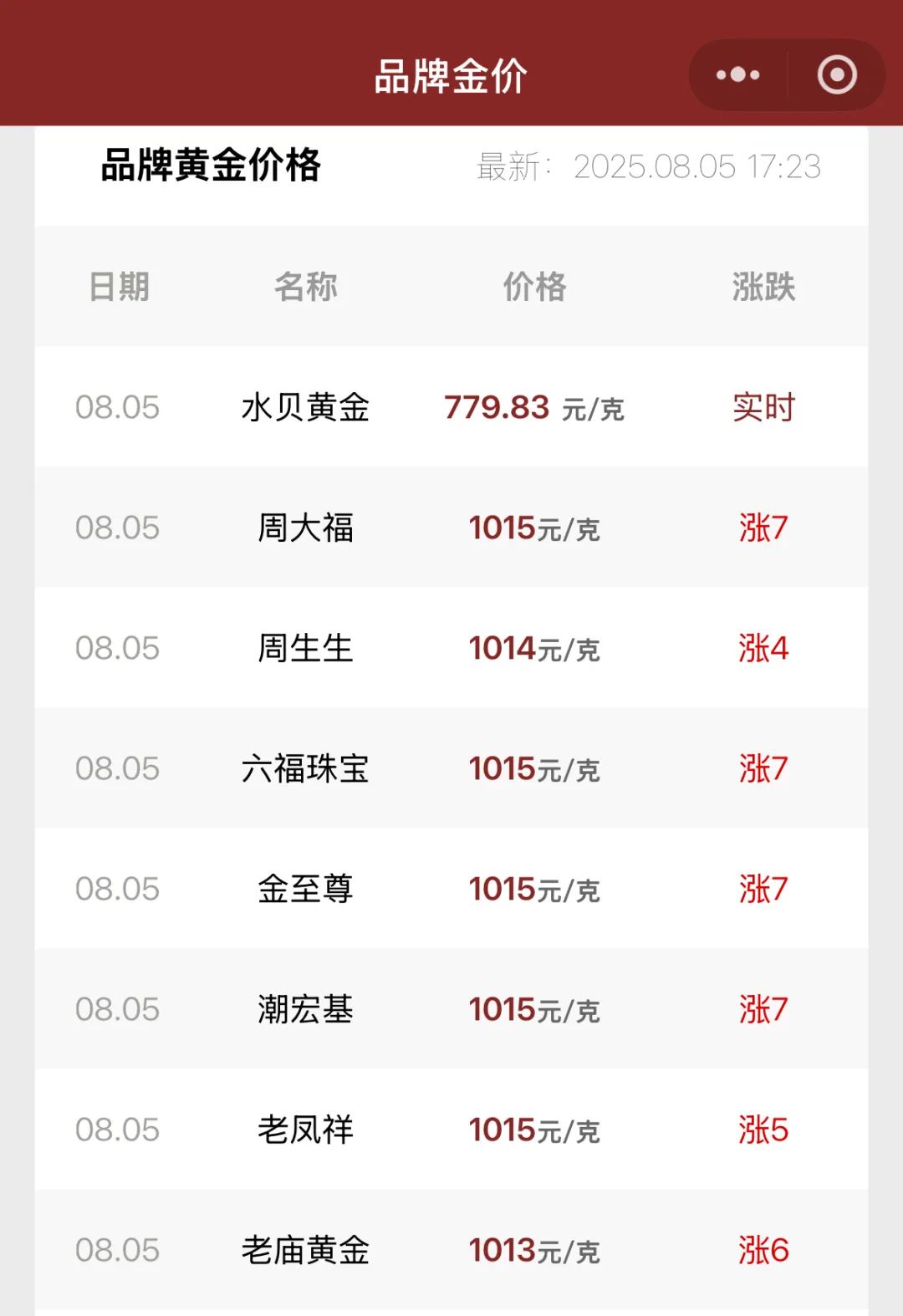 与此同时,国内品牌的足金金饰价格集体上涨,周大福、六福珠宝、金至尊、潮宏基、老凤祥等品牌的足金金饰挂牌价均高达1015元/克,克价一夜上涨5-7元。