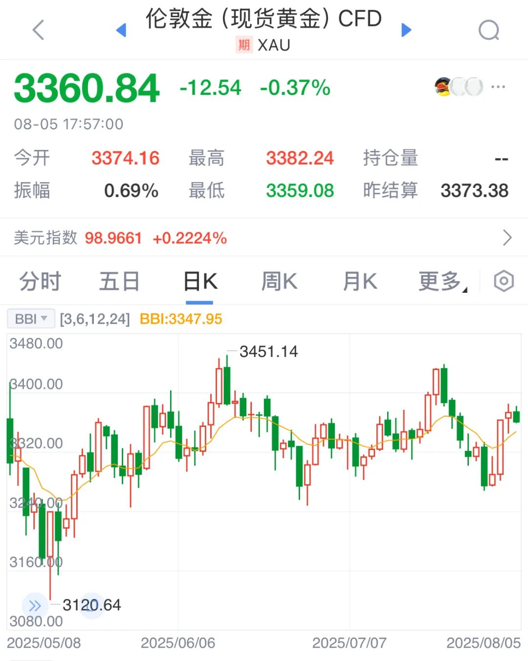 在经历了连续三天的大涨之后,今天(8月5日),现货黄金盘中最高涨至3382.24美元/盎司。