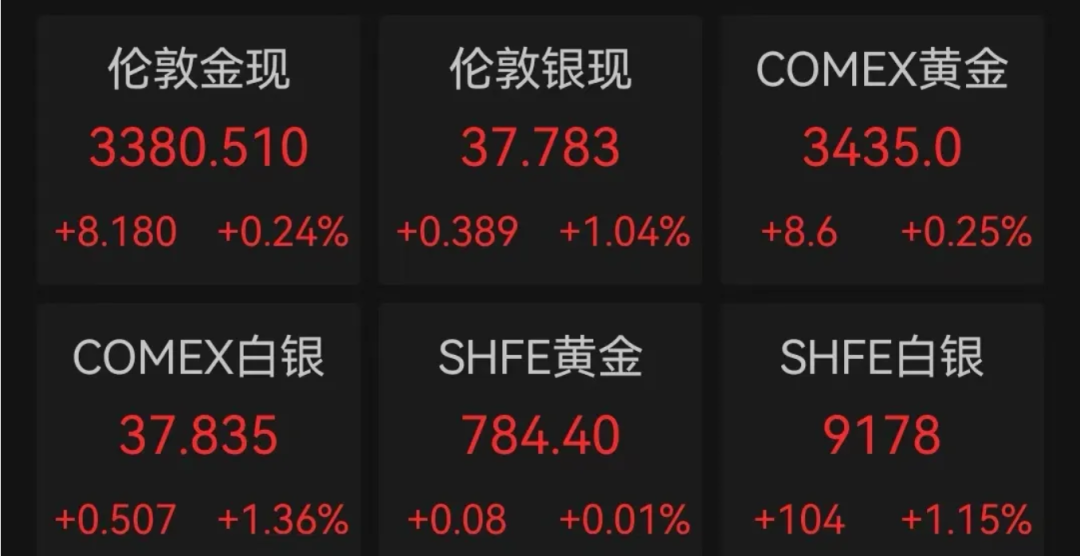 当地时间8月5日,国际贵金属期货普遍收涨。COMEX黄金期货主力合约涨0.25%,报3435美元/盎司;COMEX白银期货主力合约涨1.36%,报37.835美元/盎司。