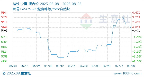 8月6日,生意社硅铁基准价为5411.43元/吨,与本月初(5528.57元/吨)相比,下降了2.12%。