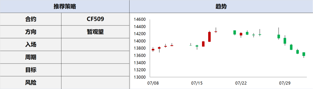 气候因素不时扰动割胶作业,ANRPC传统增产季节奏偏缓,而轮胎产线开工表现尚佳,乘用车零售增长仍然受益于政策刺激,需求兑现并不悲观,短期橡胶供需矛盾并不突出,胶价走势预计触底止跌。棉花近期内地下游开机率继续下调至6成左右,停产放假增加。中美关税压力下,终端出口也有承压,6 月棉制品出口额同比、环比双降,需求端对棉价的负反馈逐步显现;供需两端上行动力减弱,棉花弱势运行。
