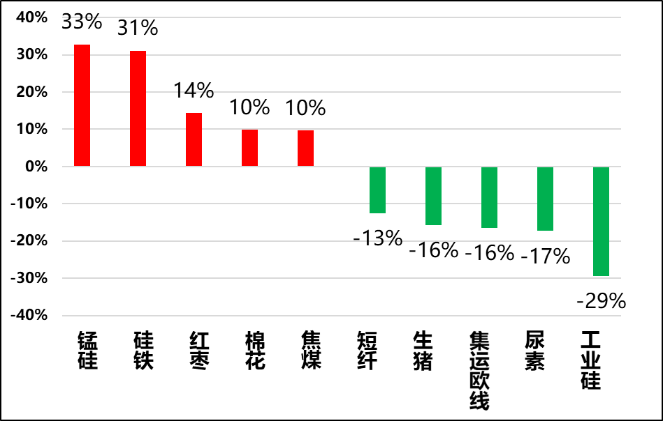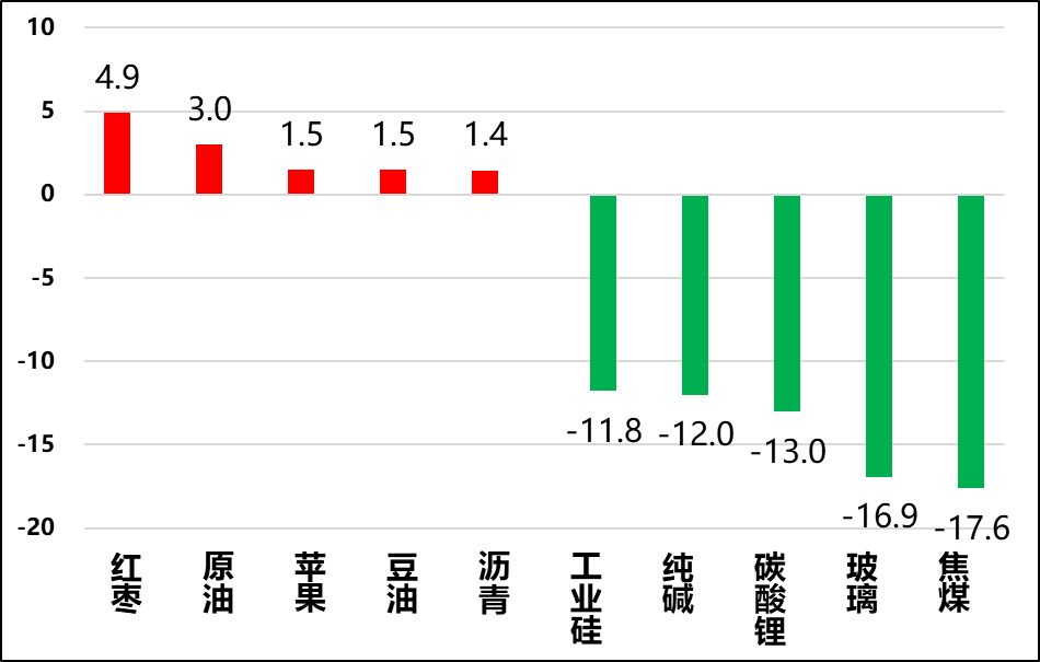 具体期货品种中,焦煤、玻璃、碳酸锂、纯碱和工业硅等品种的跌幅居前。仅红枣、原油和苹果小幅上涨。成交量方面,工业硅成交量减少29%,锰硅和硅铁成交量增加约三成。