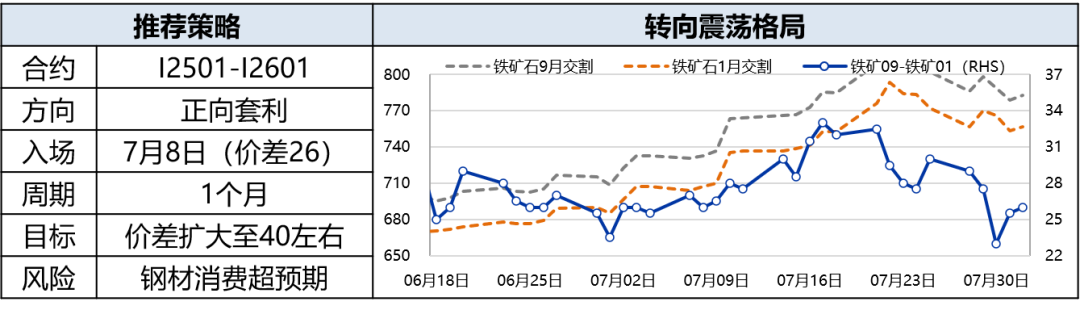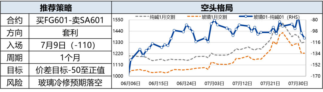 驱动:由于上半年检修较多,纯碱7-8月检修计划不多,本周纯碱日产再度回到10万吨以上。刚需变化不大,投机需求短暂释放后降温。纯碱供过于求,上游碱厂被动的格局并未发生实质性变化。玻璃基本面仍相对强于纯碱,本周玻璃厂延续去库。但随着预期交易结束,沙河湖北两大交割地基本完成投机补库,且下游订单偏弱,暂无明显投机需求,投机需求整体明显降温。地产竣工周期延续下行趋势,下游补库驱动不明显。总体看,市场回归基本面定价逻辑,但本周纯碱、玻璃价格累计跌幅已较大,且反内卷长期逻辑并未被证伪,预计下周二者或延续偏弱走势,单边策略胜率赔率均有限,继续耐心持有买玻璃01-卖纯碱01的套利策略。