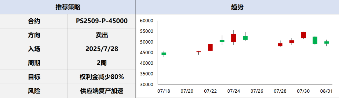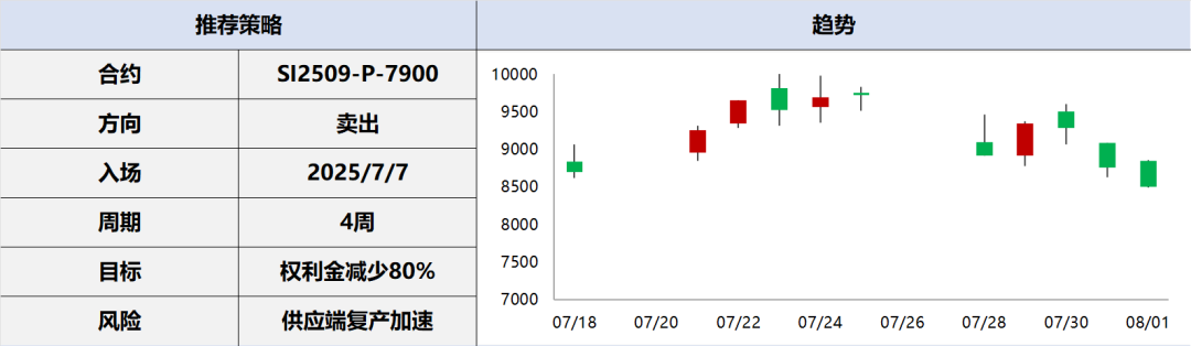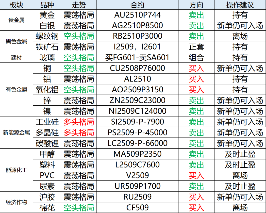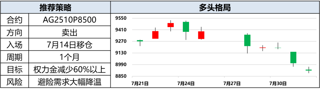 本周美国宣布与日欧等主要贸易伙伴达成协议,新关税税率将于8月7日生效,目前保留的较大悬念是欧盟各国对贸易协定的反应,以及8月12日前中美“关税休战期”会否再延期90天。虽然周四美联储议息会议继续按兵不动,并释放偏鹰信号,但周五美国公布的7月新增非农数据大幅低于预期,并大幅下修5-6月数据至极低水平,市场对美国经济的乐观预期有所降温、美联储降息预期升温。短期国内外宏观风险偏好均呈现边际回落的迹象,而长期看大国对抗、债务周期、美元信用等问题仍未得到缓解,维持黄金长期看多的观点不变。金价继续高位运行,金银比仍有修复空间,则维持白银价格震荡向上的判断。建议黄金、白银10合约的卖虚值看跌期权头寸继续持有。
