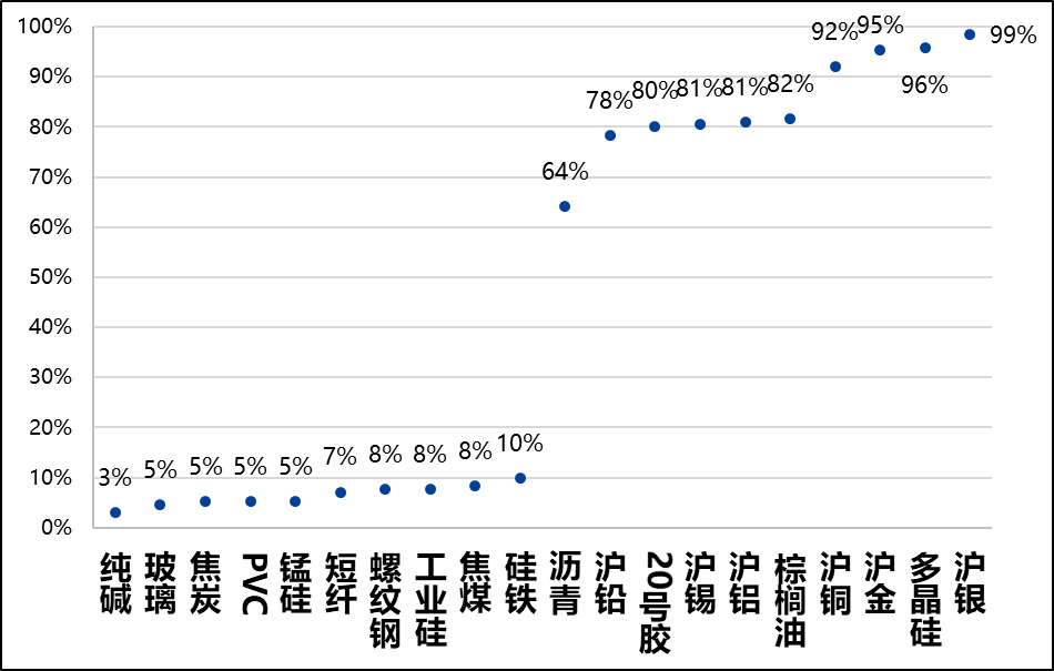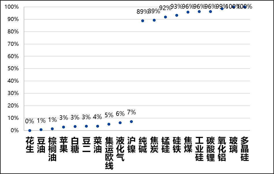 当前,贵金属和有色金属的期货价格处于近5年最高分位水平。纯碱、玻璃和PVC等品种的期货价格依然处于近5年绝对低位。波动率方面,多晶硅、玻璃和氧化铝等工业品极高,花生、豆油和棕榈油等经济作物极低。