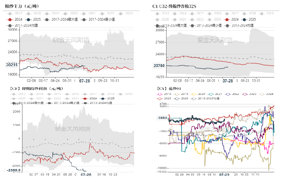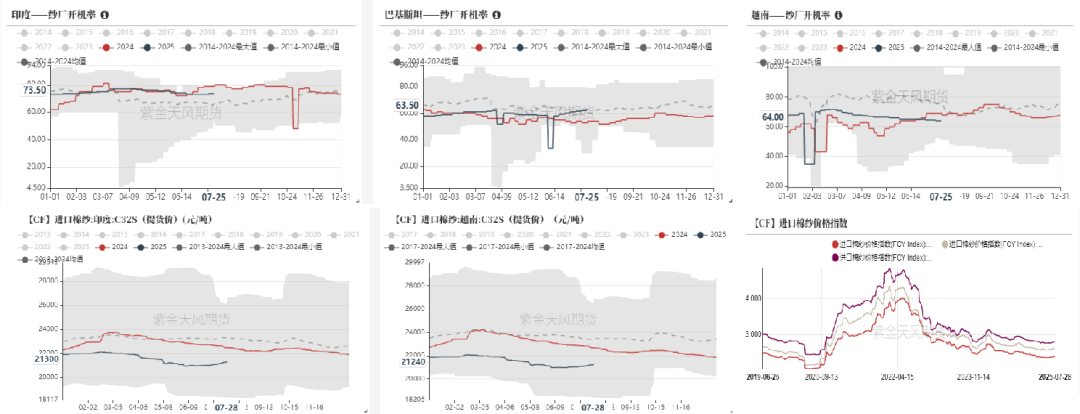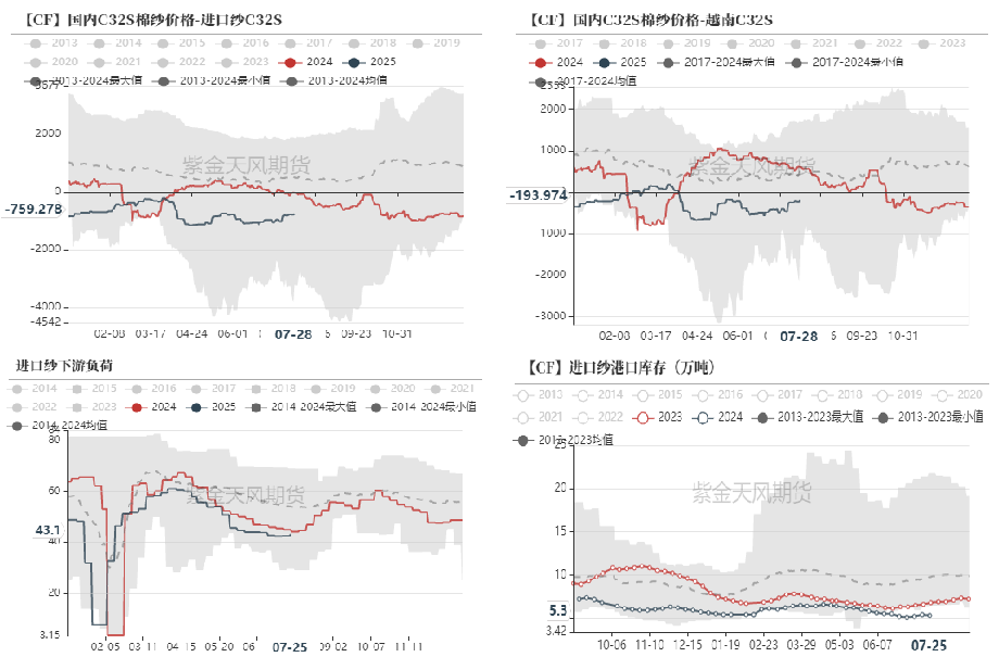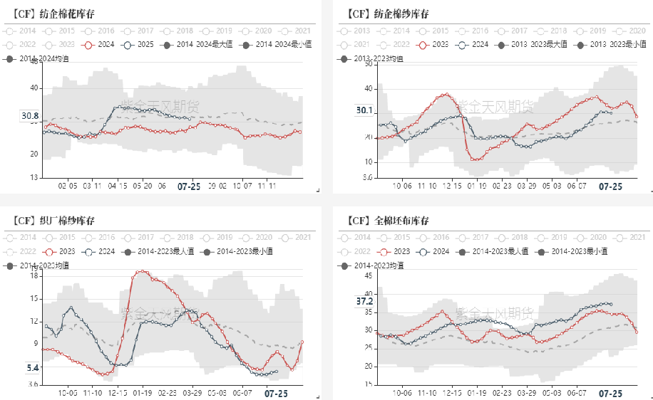 截至7月25日,纺纱厂原料库存为30.8天,小幅下降。成品库存30.1天,累库放缓。织布厂棉纱库存为5.4天,小幅补库,依然随买随用,织布厂全棉坯布成品库存37.2天,累库在坯布环节更为明显。