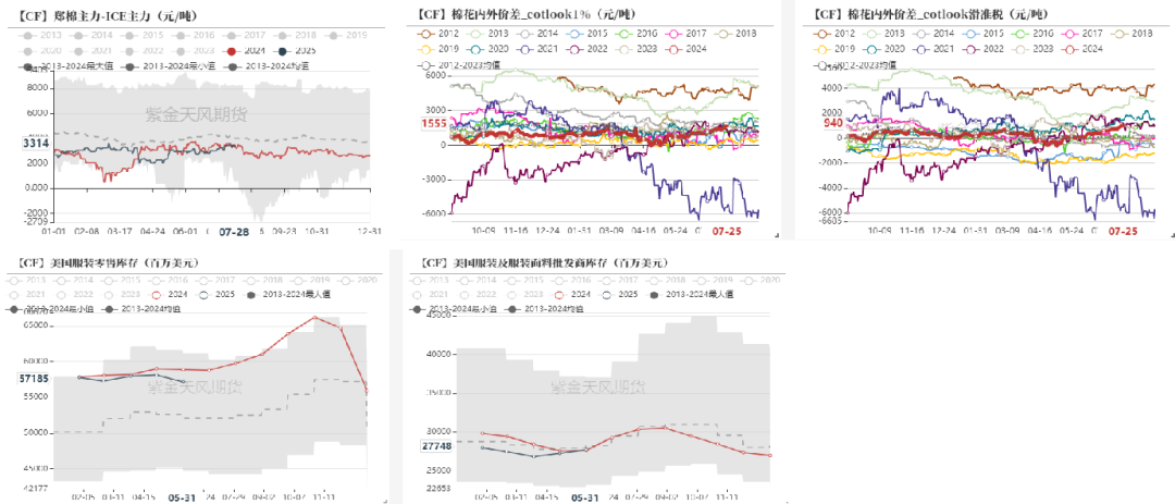 全球终端消费:偏空 美国服装及服装面料批发商库存去库,但零售商库存高位(偏空),我国棉纺出口东南亚份额上升,但是欧美日韩份额下滑(偏空)。东南亚纱线开机率稳定。美国对我国终端制裁导致订单流失(偏空)。