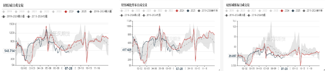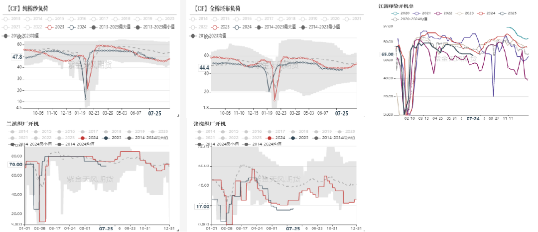 截至7月25日,棉纱厂开机负荷为47.8%,下降至去年同期水平。织厂整体开机率在44.4%,低于去年同期水平。分地区看张槎开机达到历史低位,兰溪小幅降低开机。