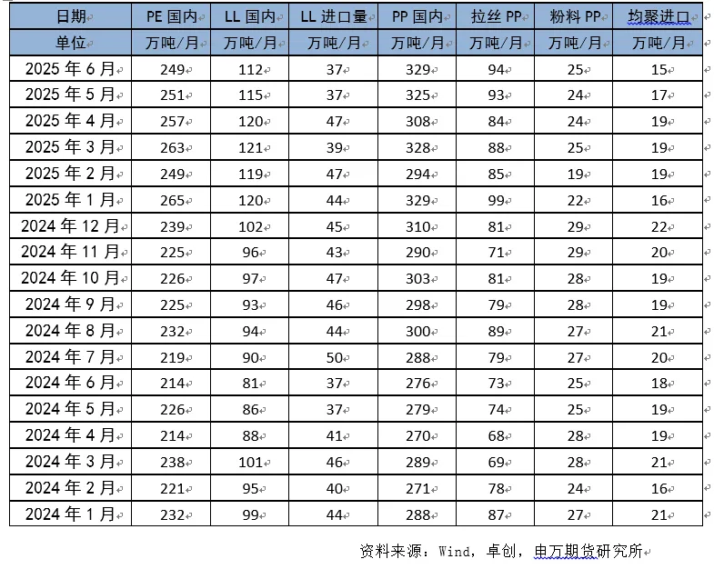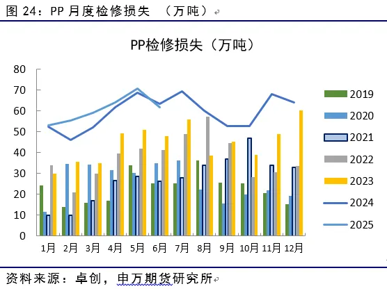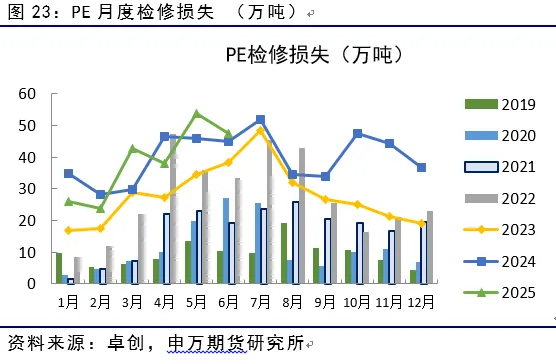 2025年6月,国内聚烯烃(PP、PE)检修装置导致的产量损失量环比小幅下降。其中PE达到47.59万吨,PP达到61.71万吨。7月实际检修方面,PE的停车产能占比为14.357%,较6月下降1.101%。PP的停产产能占比16.7%,较6月上升1.925%。总体而言,7-8月国内夏季检修进入旺季,检修损失量的增加有助于加快聚烯烃2个品种的供需修复速度。