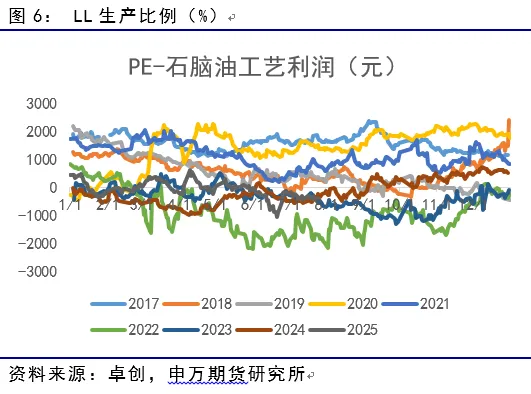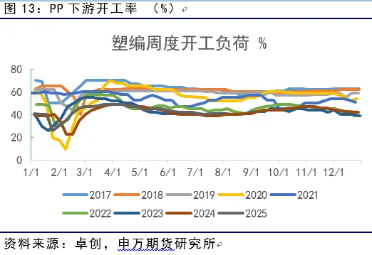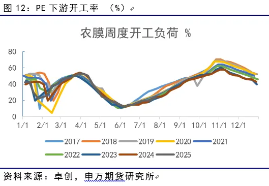油制拉丝PP,加工利润7月逐步转弱,目前在-650元水平。煤制拉丝PP的加工利润7月下降为主,目前约为450元。PE下游农膜开机率7月逐步回升,目前为25%。