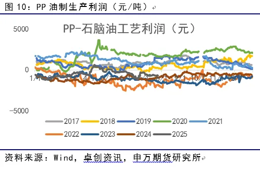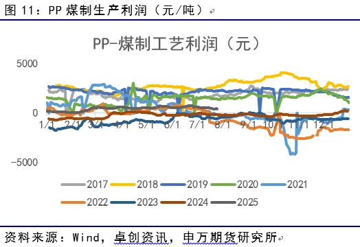7月拉丝PP排产比例总体不高,一方面下游塑编行业消费处于淡季,同时聚丙烯自身也处于供给收缩的过程。油制线性的生产利润7月小幅下降,目前生产毛利为-350元。煤制线性的生产利润7月生产利润回落,目前约为600元。