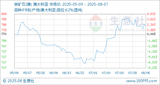 8月7日生意社铁矿石(澳)基准价为788.56元/吨