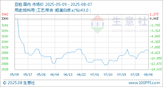 8月7日,生意社豆粕基准价为3012.00元/吨,与本月初(2984.00元/吨)相比,上涨了0.94%。