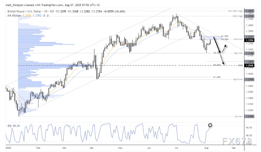英国央行今日预计将利率下调25个基点至4%,隔夜指数掉期(OIS)市场已对此次降息进行完全定价,且价格隐含了鸽派倾向,1年期OIS显示未来12个月至少再降息25个基点。交易者需重点关注周四(8月7日)晚间的英国MPC会议的投票分布:若支持降息的票数增加,或暗示更多宽松将至,可能进一步压制英镑,尤其是叠加鸽派评论时。