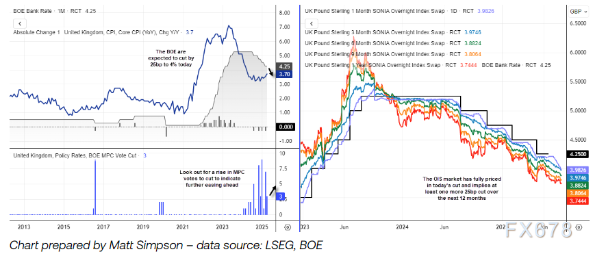汇通财经APP讯——周四(8月7日)晚,北京时间19:00,英国央行将公布8月利率决议结果,市场普遍预期其将下调基准利率25个基点至4.0%,这将是自2024年8月以来的第五次降息,标志英国正式进入“宽松周期”。尽管降息大局已定,但货币政策委员会(MPC)内部陷入激烈分歧:此次决议的关键不仅在于降息幅度,更在于政策声明中的前瞻指引:若删除“渐进谨慎”表述或弱化通胀预期措辞,可能释放更强鸽派信号,进一步压制英镑汇率。