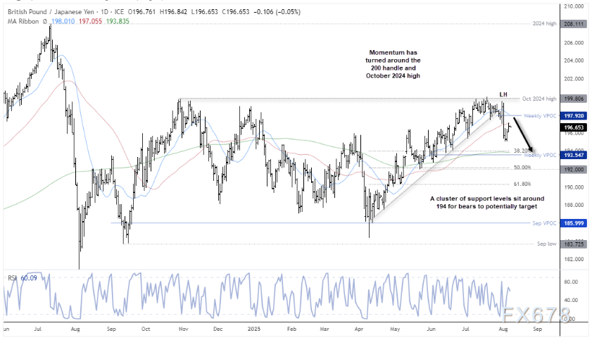 英镑兑日元自4月184涨至7月近200(遇阻2024年10月高点)后,跌破上涨趋势线并且价格形成更低的肩部,看跌动能加速。当前价格处于回撤阶段,与英镑兑美元类似,日线或形成因动能惯性形成没有成交量的高点。