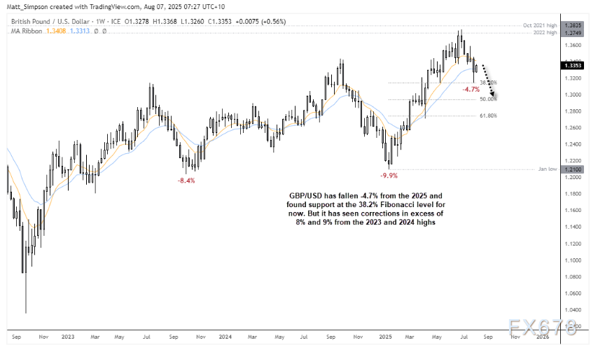 英镑兑美元周线视角:英镑兑美元自7月高点下跌4.7%,其中半数跌幅发生在上周的看跌吞没K线形态期间。考虑到多数下跌倾向会以一共三浪的形式展开,当前跌幅(4.7%)相对较浅(2023年高点以来跌幅8.4%,2024年高点以来9.9%),未来数周或数月可能进一步下行。关键支撑位包括成交密集区的1.2938,以及4月低点与61.8%斐波那契回撤位(略高于1.2700)。