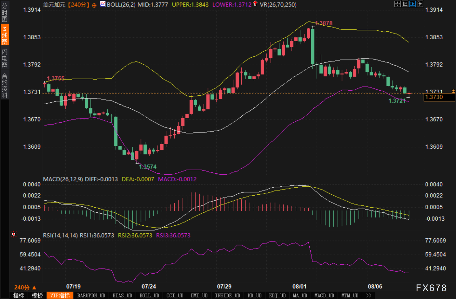 阶段低点1.3721构成当前短线支撑,若失守该位,或将测试布林带下轨1.3712附近。反之,若汇价短期内回升至1.3777布林中轨上方,才能缓解短线空头压力。