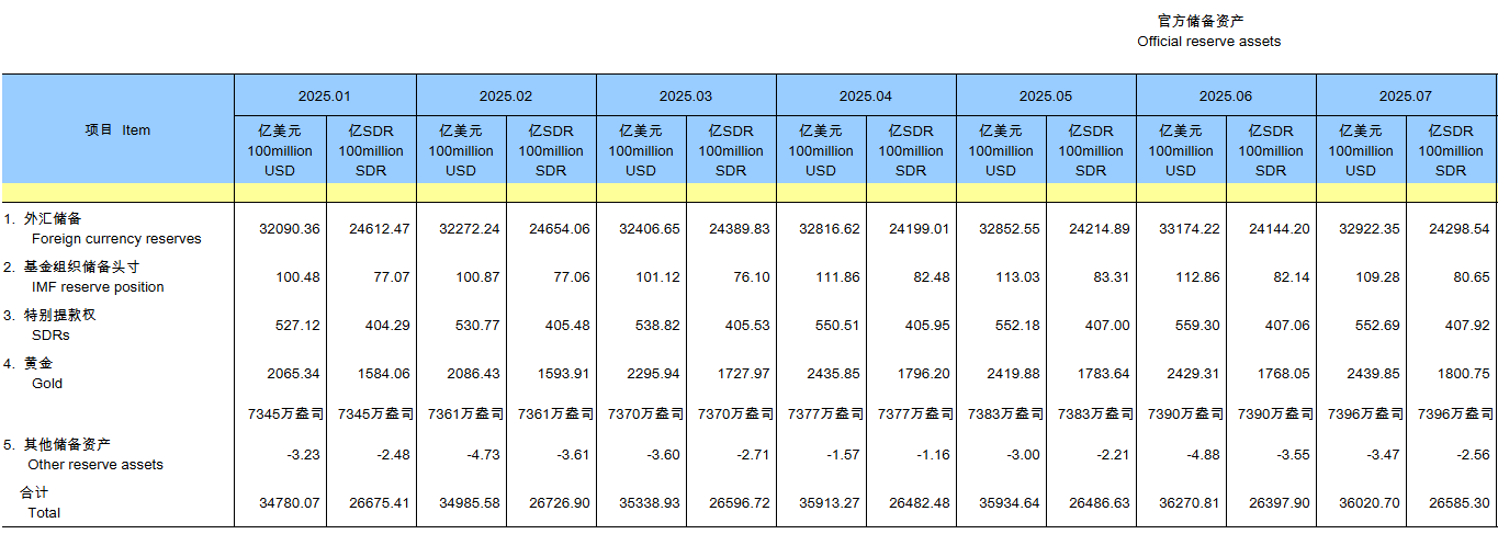 【大河财立方记者杨萨】8月7日,国家外汇管理局发布数据显示,截至2025年7月末,我国外汇储备规模为32922亿美元,比6月末下降252亿美元,降幅为0.76%;中国7月末黄金储备报7396万盎司,环比增加6万盎司,为连续第9个月增持黄金。