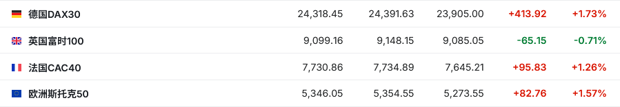 2. 截至发稿,德国DAX指数涨1.73%,英国富时100指数跌0.71%,法国CAC40指数涨1.26%,欧洲斯托克50指数涨1.57%。