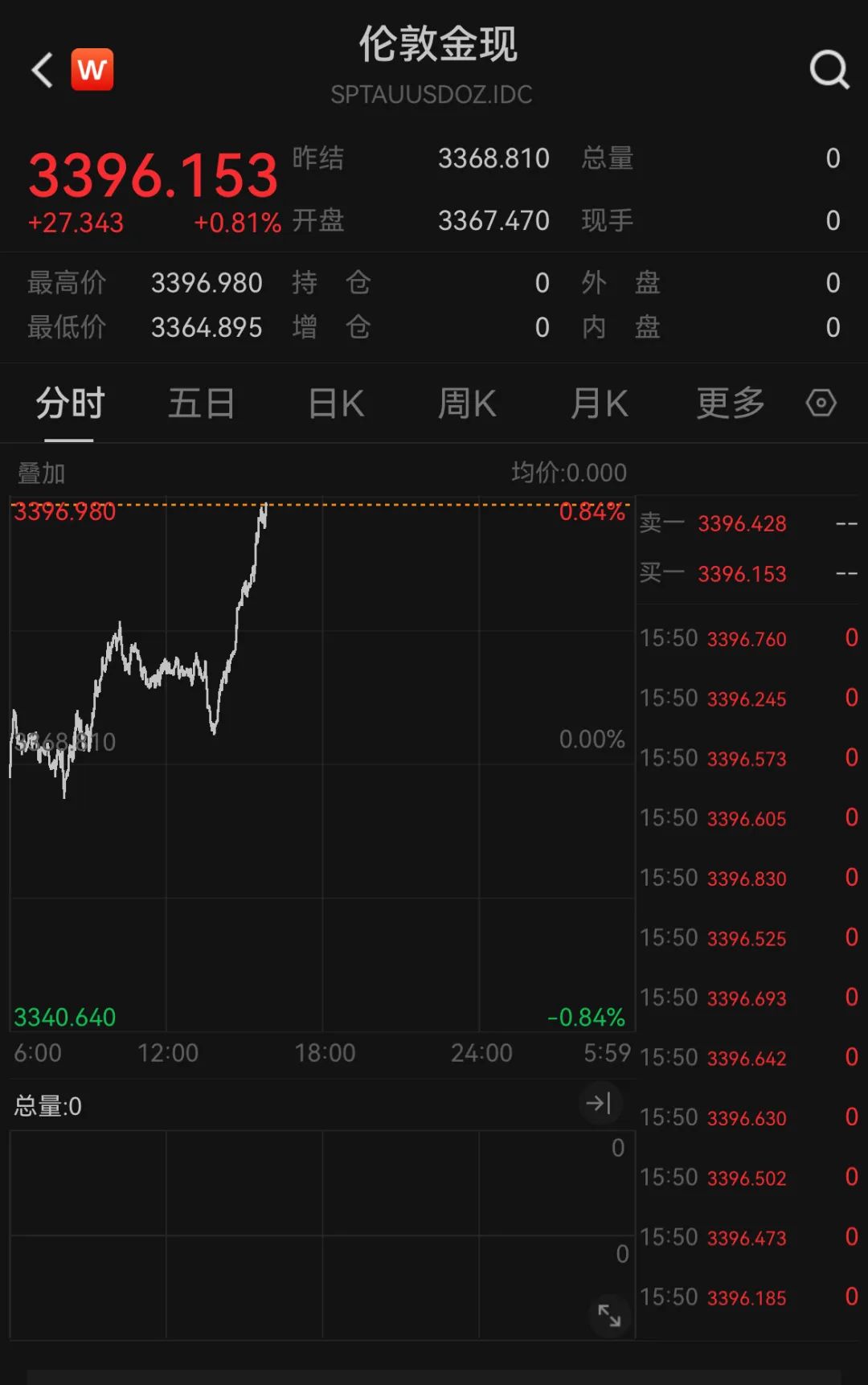 截至发稿,现货黄金报3396.153美元/盎司,COMEX黄金报3466.7美元/盎司。