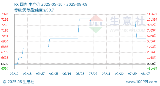 8月8日,生意社PX基准价为7000.00元/吨,与本月初(7250.00元/吨)相比,下降了3.45%。