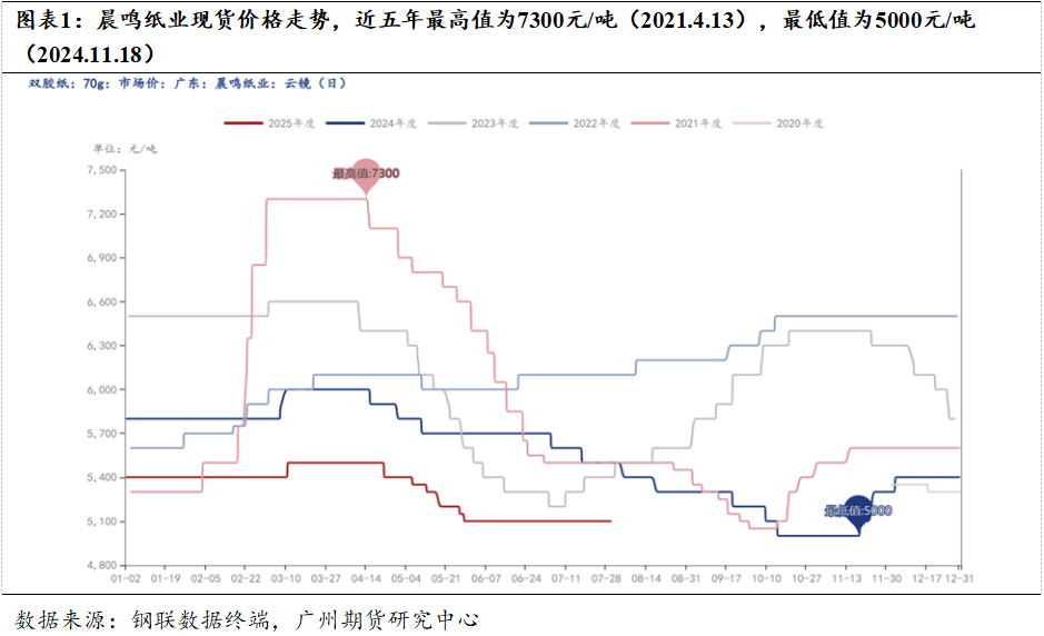 从过去五年双胶纸现货价格的走势来看,我国双胶纸市场经历了明显的价格波动周期。以纸业龙头晨鸣纸业的现货价格为例,2019年末至2020年,双胶纸价格出现明显下跌趋势。但伴随经济复苏提速,全球纸张需求回暖,同时原材料在此期间也大幅回升,并在2021年上半年达到近五年的峰值7300元/吨上下。随后至21年末,开启了一轮持续下行的周期。2022年双胶纸经历了全年的稳步修复式上涨,主要因为原料木浆价格高位,行业利润持续受到挤压,企业提涨意愿强烈,此外出版招标类订单稳定释放,叠加年中部分教材重印,支撑价格稳步上行。至2023年上半年,双胶纸价格回到6600元/吨附近。2023年下半年至今,随着我国纸张需求增速放缓,市场供需逐步转为供应过剩,在此时间段虽有一轮反弹(2023年中-年末,主因部分产线临时停机导致双胶纸供应阶段性收紧,且教辅教材需求的释放带动双胶纸价格出现反弹。),但整体来看双胶纸价格开启了新一轮长期持续回落的走势,目前呈现低位震荡态势,期间于2024年11月触及五年的最低值,在5000元/吨上下。