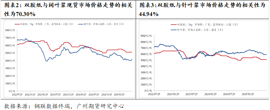 以晨鸣纸业的双胶纸市场价和阔叶浆市场主流价为例,两者过去三年价格走势相关性为70.30%。以晨鸣纸业的双胶纸市场价和针叶浆市场主流价为例,两者过去三年价格走势相关性为44.94%。值得注意的是,纸浆期货的标的物为针叶浆。