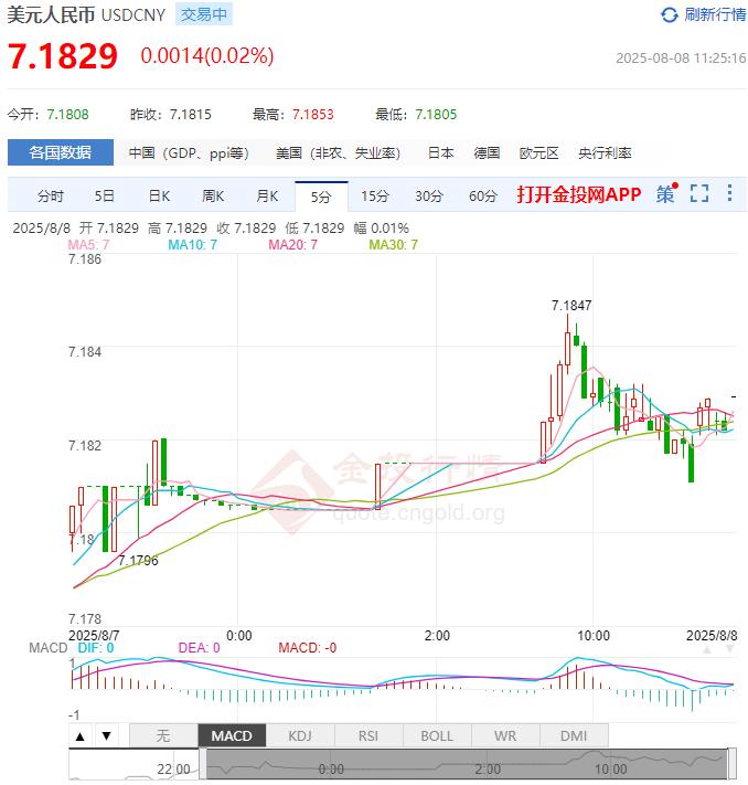 截至发稿,美元兑换人民币汇率报价7.1829,涨幅0.02%,最高价7.1853,最低价7.1805,今日美元/人民币汇率开盘价7.1808。