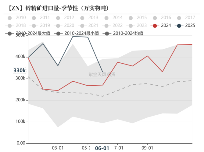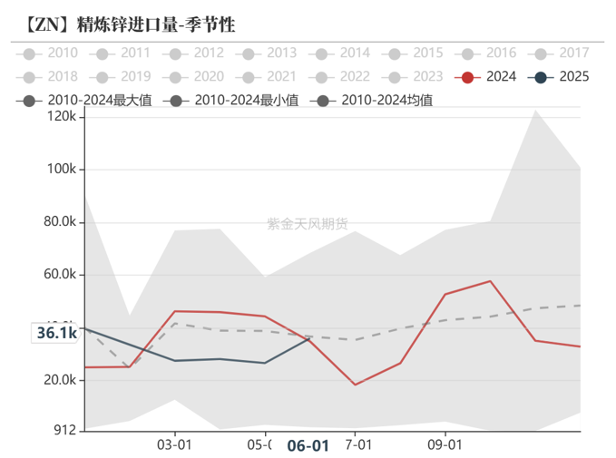海关数据显示,2025年6月中国进口精炼锌3.6万吨,同比增加3.24%;