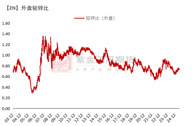 铅锌比价小幅上扬,截至本周四内盘铅锌比为0.75,外盘铅锌比0.71。