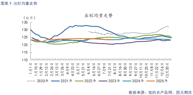 截至7月25日,生猪出栏均重123.67公斤,较上月末环比上升0.05公斤。随着气温不断升高,终端需求低迷,养殖端降重意愿较强,6月出栏均重处于高位。进入7月,大猪存栏下降,缩量挺价情绪渐起,猪价走强。7月中下旬后,终端对高价承接力有限,养殖端认卖情绪升温,加之政策引导规模场降重,大猪再度加速出栏。